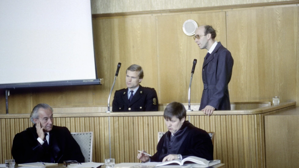 I RETTEN: Arnfinn Nesset, da 46 år gammel, stående ved mikrofonen i Frostatings lagmannsrett i 1982. Foto: Erik Thorberg / NTB