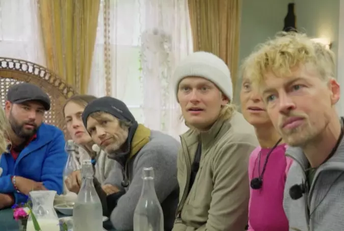 Kjendisene på Fredheim gård i Søgne gjør seg klare for å legge den første uken bak seg når en av deltakerne tar ordet ved langbordet.