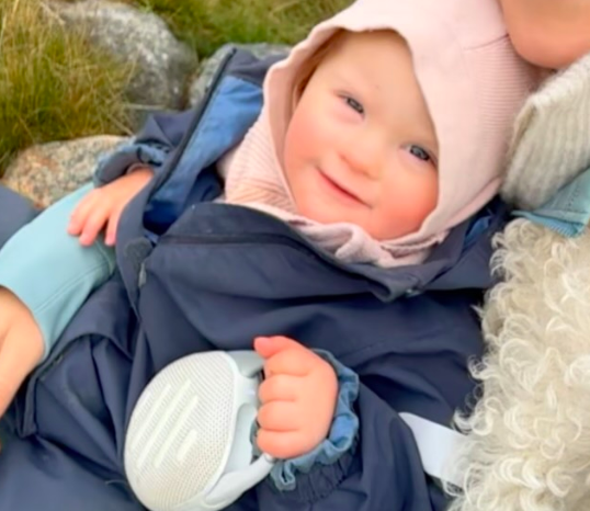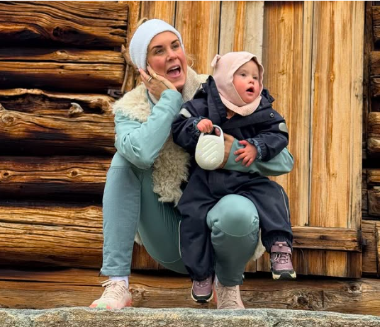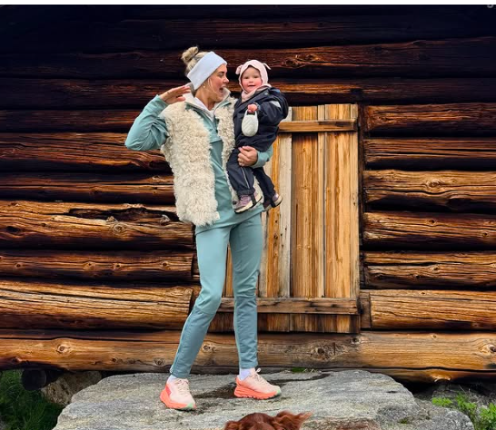 For kort tid siden publiserte hun et varmt bilde fra fjellet. På armen holder hun datteren, med familiens hund foran seg og en gammel tømmerhytte i bakgrunnen.