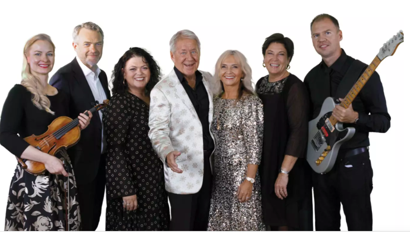 SYNGER UT: –Når folk går på julekonsert, så er det for å få julestemning. Og det skal de få, lover Rune Larsen sammen med sine medmusikanter Anne Veddeng, Jon Martin Skauge, Vidar Eldholm, Lisbeth O. Sandvik og Kristin Bergsvik. Foto: Erlend Haukland