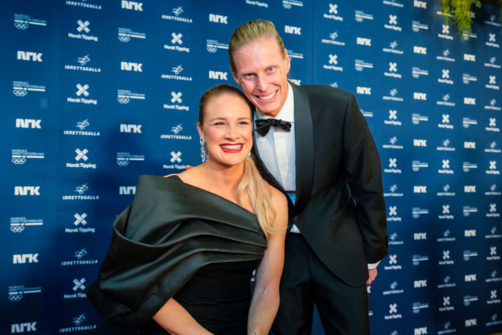 Birgit Skarstein og hennes nye kjæreste under rød løper under Idrettsgallaen 2025 i Trondheim spektrum. Foto: Ole Martin Wold / NTB