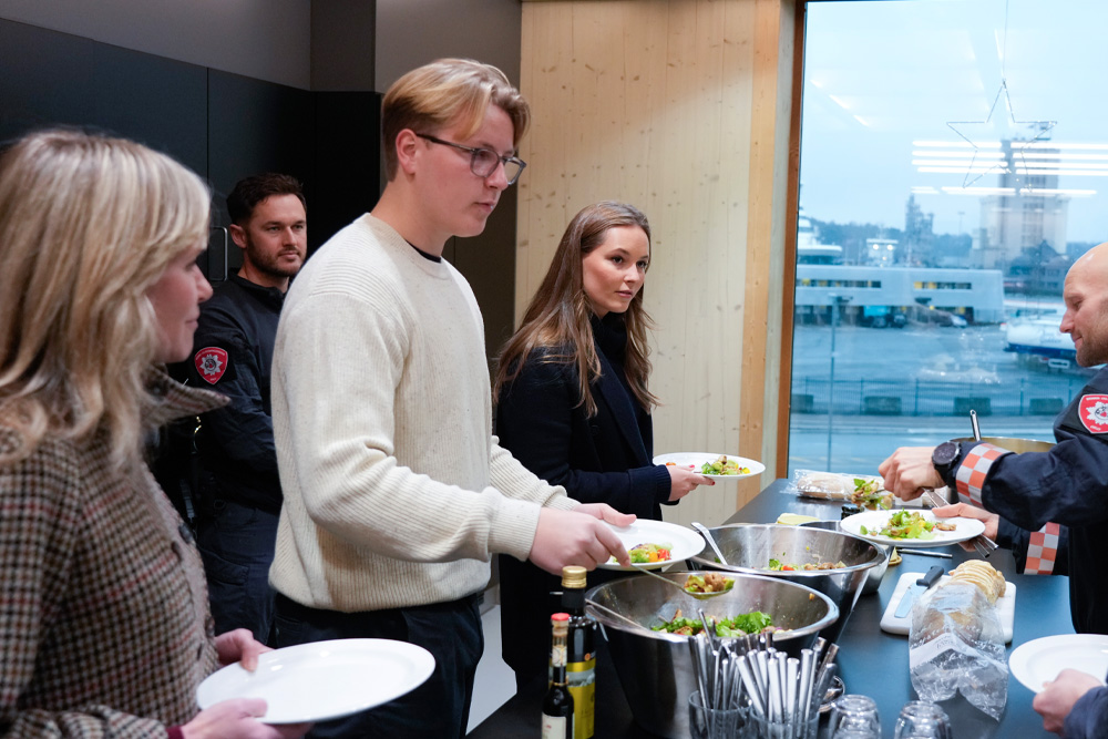 På brannstasjonen fikk de omvisning og spiste lunsj med mannskapet. De kongelige fikk også skli ned brannstanga, og ble med opp i brannstigen som ruver hele 30 meter over bakken.