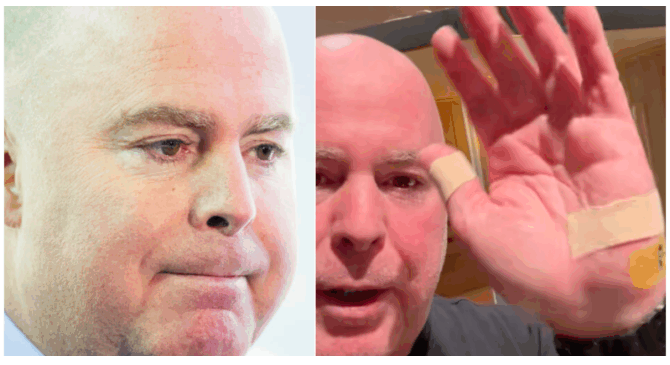 Mandag deler Jan Tore Kjær at han har vært i en blodig ulykke hjemme denne helgen. I en video på TikTok viser han at glassdøra inn til badstuen ligger i tusen knas på gulvet.