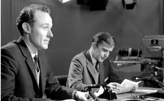 Jarl Munch begynte i Dagsrevyen i 1965. Her i studio fra en nyhetssending i 1968. Foto: NTB