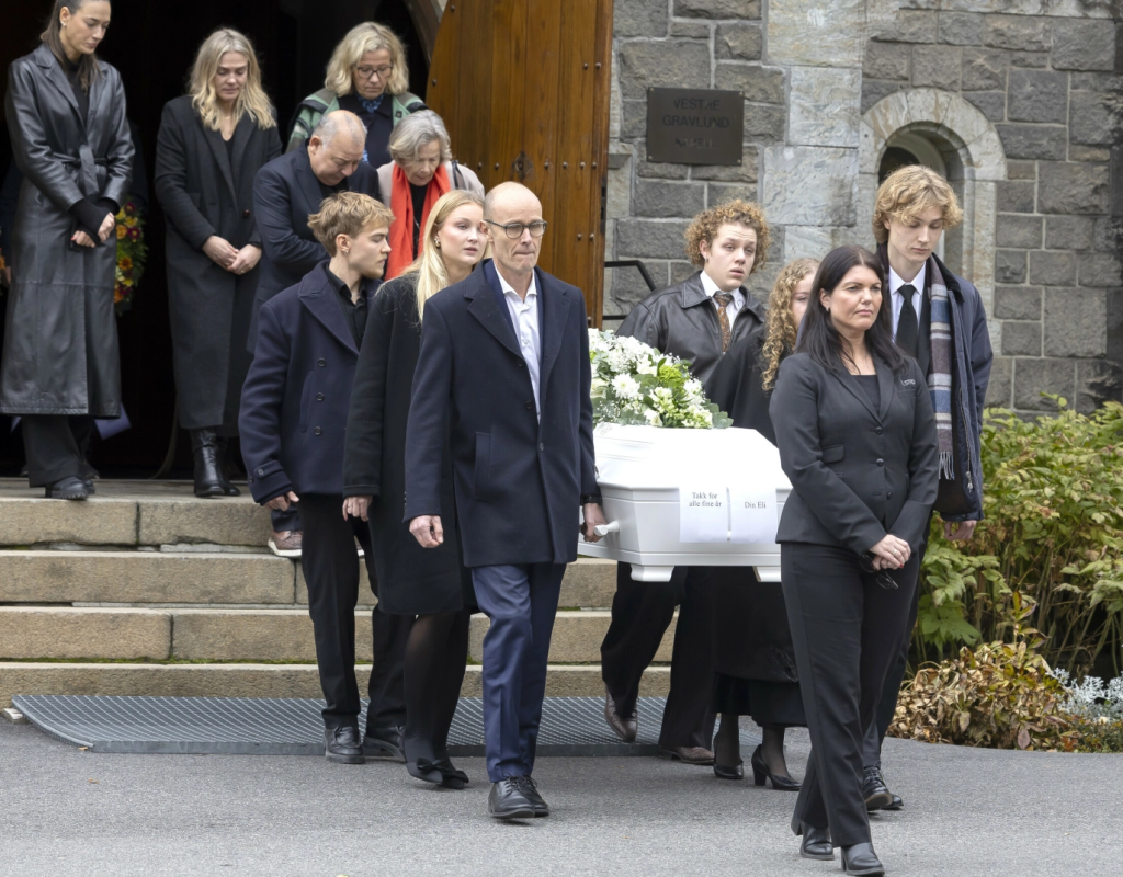 SISTE REIS: En preget familie bar Jarl Munchs kiste. Foto: Tore Skaar / Se og Hør