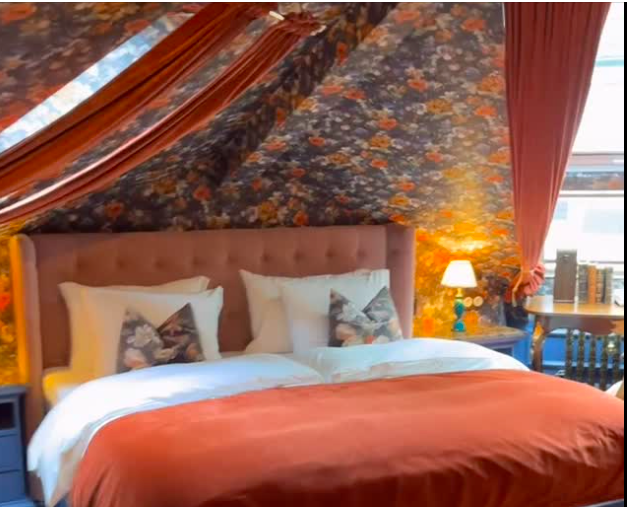 Videoen viser et vakkert hotellrom i klassisk, fransk stil – med blomstertapet, tunge fløyelsgardiner og lune farger som oser av romantikk. Det er ikke vanskelig å forstå hvorfor han kaller det et “drømmehotell”.