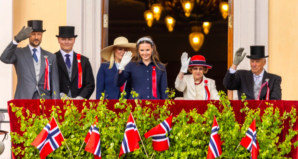 SLOTTET: Prins Sverre Magnus, kronprins Haakon, kronprinsesse Mette-Marit, prinsesse Ingrid Alexandra, dronning Sonja og kong Harald ved slottsbalkongen under årets 17. mai. Foto: Amanda Pedersen Giske / NTB