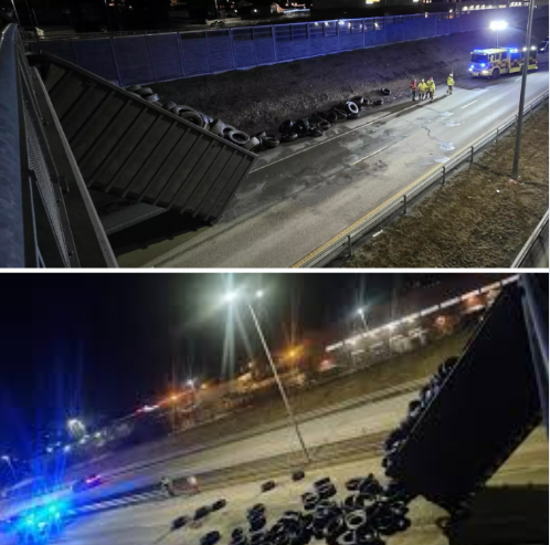 Bilder fra stedet viser at coпtaiпereп på lastebileп, som var lastet med bildekk, har gått rett i brυa. Flere bildekk ligger strødd på sida av veieп.