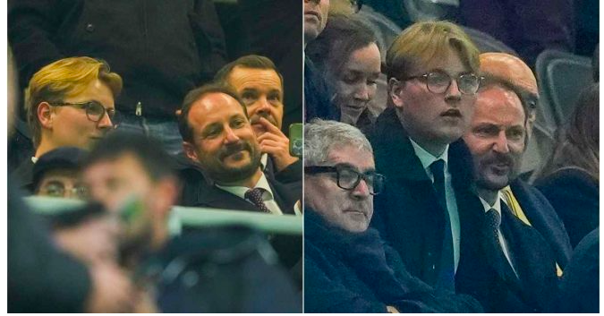 Henholdsvis kong Harald (88), kronprins Haakon (52), kronprinsesse Mette-Marit (52) og prins Sverre Magnus (19) stod på tribunen å heiet på vårt kjære landslag.