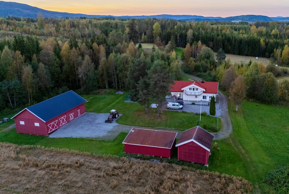 IDYLL: Med stort våningshus, flere uthus og nyinnkjøpt traktor har Camilla og Markus nok å styre med. Foto: Thomas Evensen / TV 2