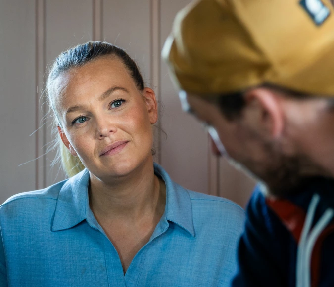 Camilla har tårer i øynene når hun ser bort på kjæresten.