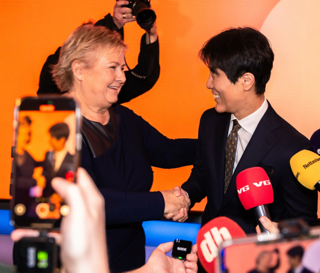 GODT JOBBET: Fredrik har gjort en formidabel jobb som programleder i Debatten, men han var også meget dyktig før han startet her, sa Erna til Se og Hør. Fra Høyre hadde hun med en rødvin fra sitt favorittland – Spania.