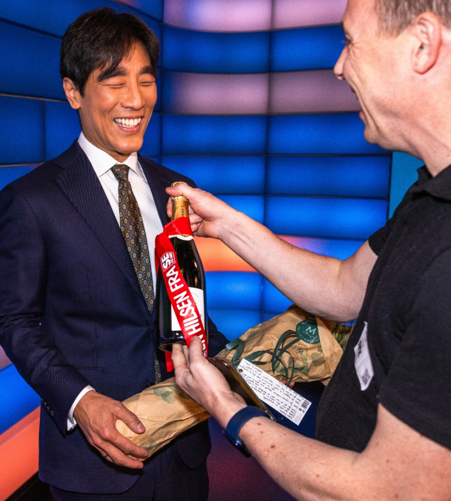 STRÅLENDE FORNØYD: Når Fredrik enn så lenge er et stykke unna Kongens fortjenstmedalje – så fikk han det nest beste hederstegnet: Champagne fra Se og Hør.