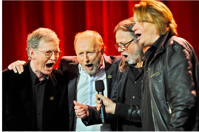 Fra v.: Øystein Sunde, Halvdan Sivertsen, Lillebjørn Nilsen og Jan Eggum (Gitarkameratene) vant hedresprisen under utdelingen av Spellemannprisen 2011 i Folketeatret lørdag Foto: Fredrik Varfjell / NTB