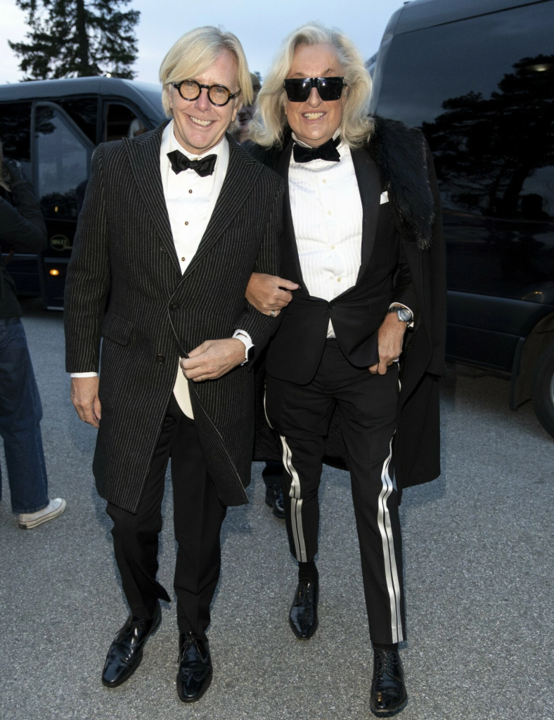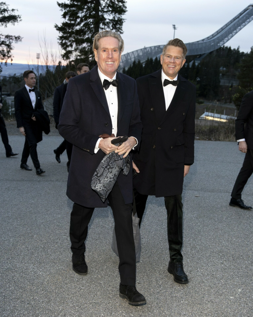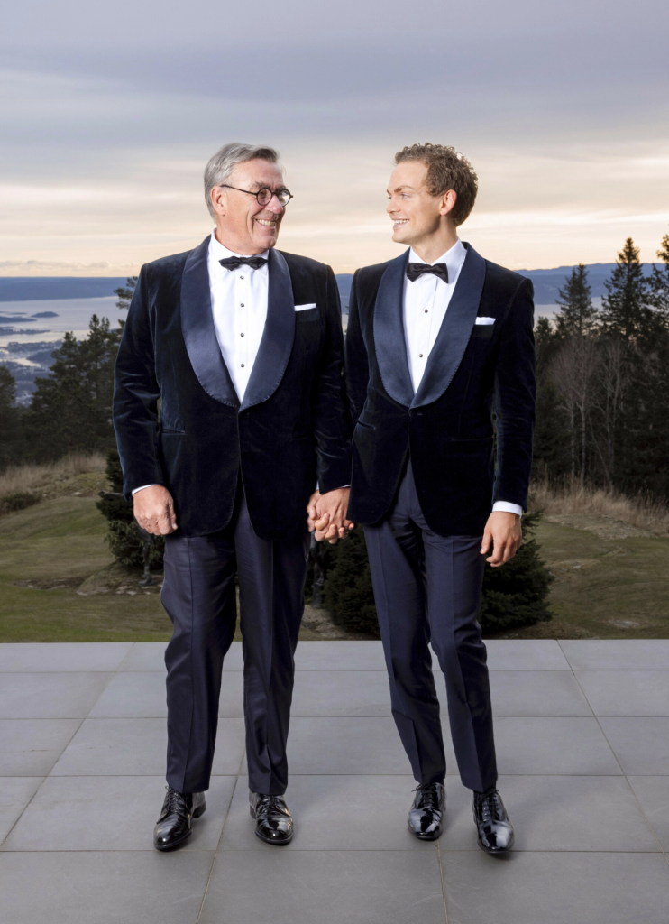 KLAR FOR BRYLLUP: Georg Stang (67) er bror til Caroline Stang – som Stein Erik har sønnen Nicolai med. Han kom hånd i hånd med vennen Steven Somerscales Goldenburg (28). Foto: Andreas Fadum