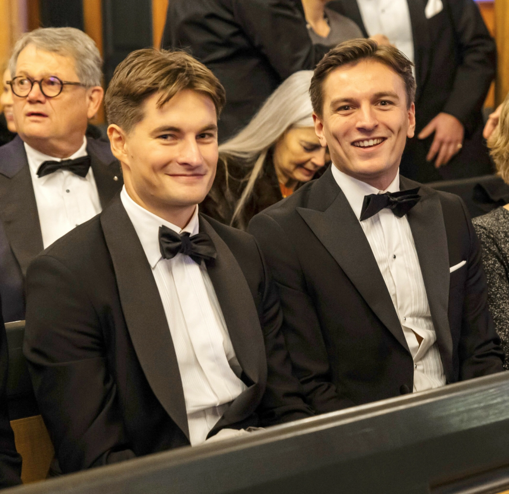 FLOTTE GUTTER: Robert Stoltenberg og samboeren Christian Grønvold er gode venner av brudeparet. Robert måtte dra før vielsen var over – han skulle rekke «Maskorama». Men han kom tilbake til festen! Foto: Andreas Fadum