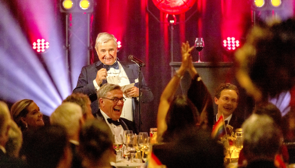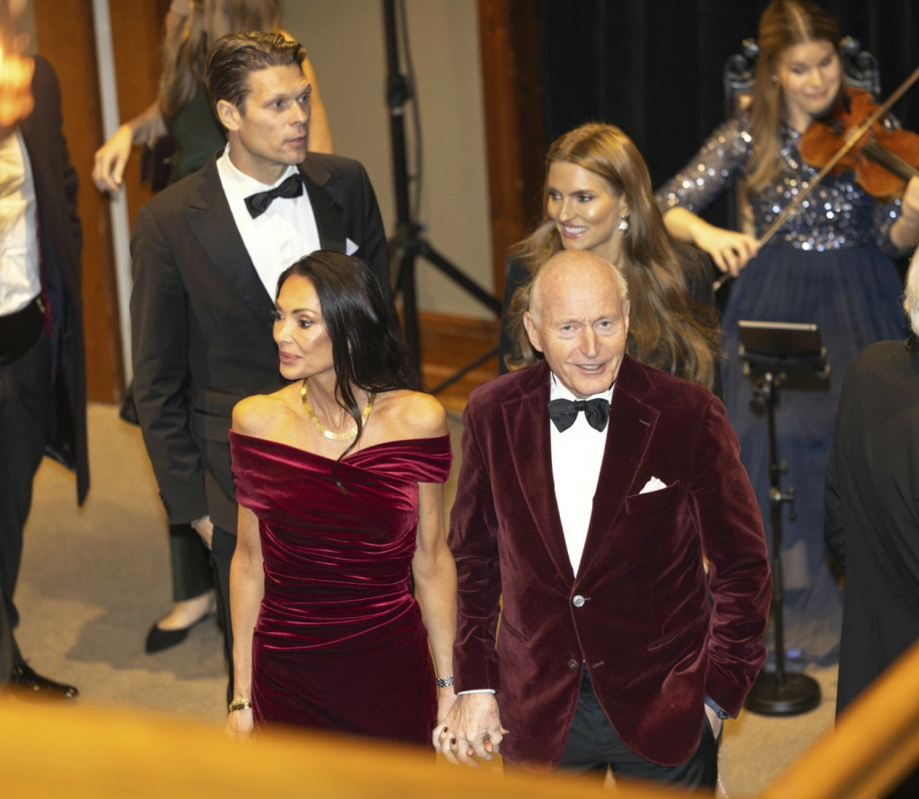 TALTE AV ERFARING: Christian Ringnes kom hånd i hånd med sin kjæreste Kari-Lena Flåten (53). Til Se og Hør var eiendomskongen tydelig på sitt beste ekteskaps-råd til Stein Erik og Bendik: – Hold ut! Bak ser vi datter Isabelle (37) og hennes Skage Ringnes Grønneberg (43). Foto: Andreas Fadum