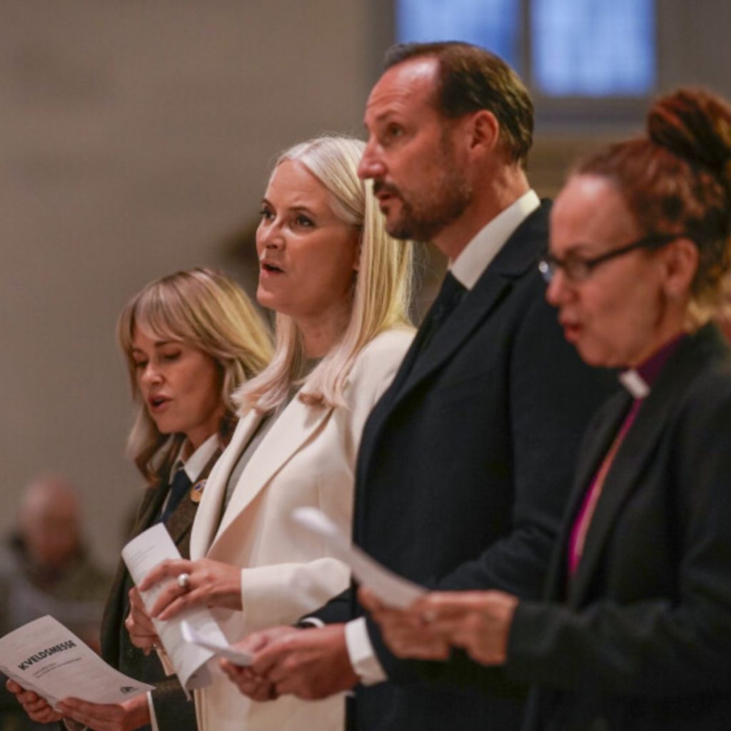 F.v.: Oslos ordfører Anne Lindboe, kronprinsesse Mette-Marit, kronprins Haakon og Oslos biskop Sunniva Gylver i Oslo domkirke i forbindelse med at Den norske kirke ba om unnskyldning til skeive. Arrangementet var første gang Mette-Marit viste seg offentlig etter lungerehabiliteringen. Foto: Thomas Fure / NTB